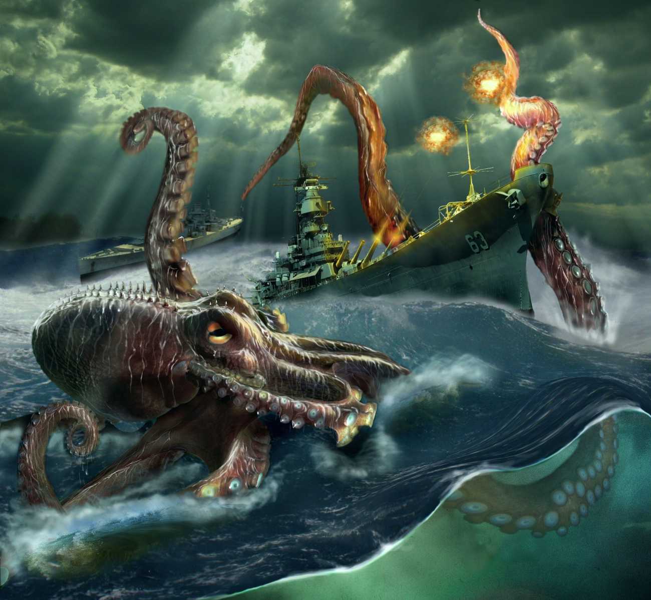 Есть такие примеры, как Кракен из скандинавской мифологии, который представляет собой огромное чудовище из глубин, которое вышло на поверхность, чтобы атаковать корабли и поедать моряков. Другой соответствует Аккорокамуи, монстру огромных размеров, входящему в фольклор айнов.