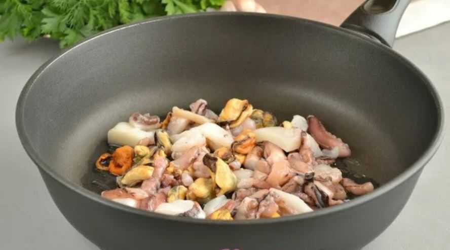 Креветки и мидии заранее разморозить, очистить и помыть.