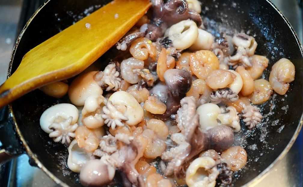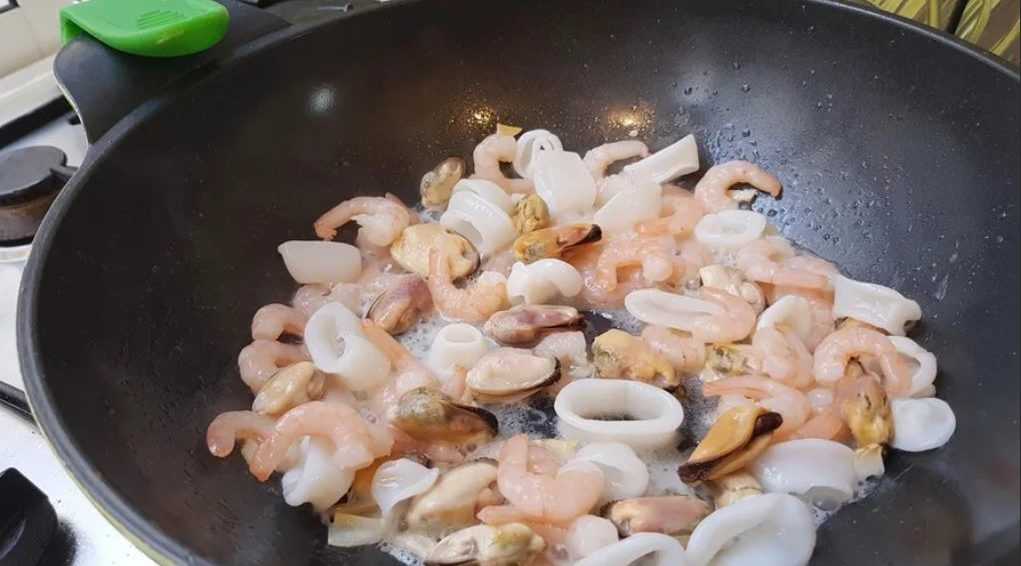Макароны отправить к моллюскам, туда же высыпать креветки с кальмарами и жидкостью от них.