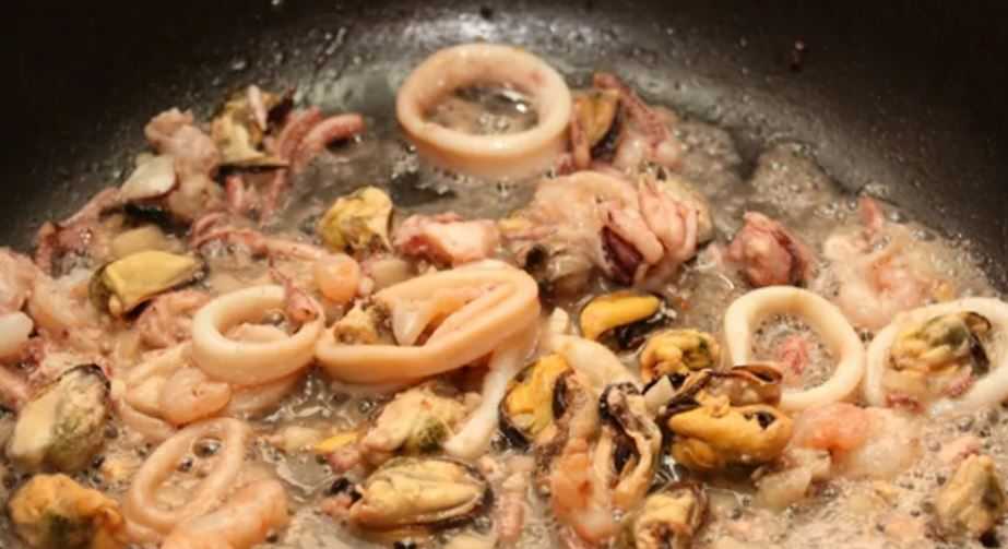 На отдельной сковороде обжарить с оливковым маслом креветки прямо в панцире и кальмары нарезанные кольцами. Приправить солью и молотым перцем, добавить томатный соус и помидоры черри. Готовить не больше 3 минут. Затем снять с плиты.