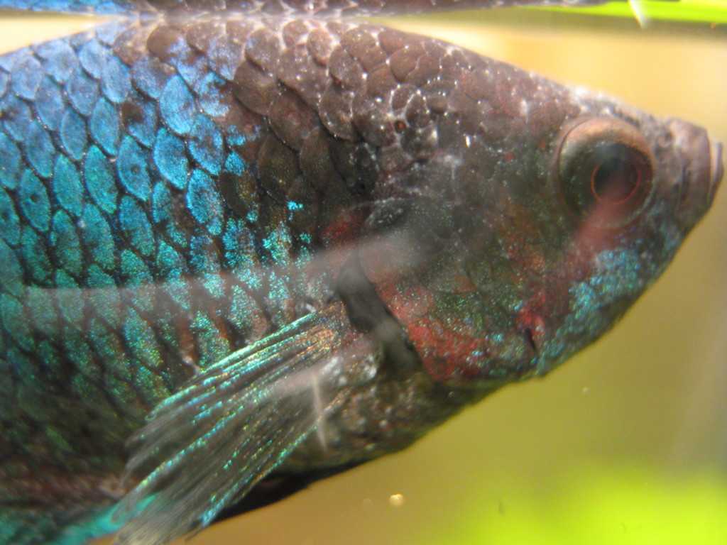 Далее за гнездом ухаживает самец — он съедает мёртвые икринки, обновляет гнездо. Кормить его в это время не надо, воду менять тоже не надо. Через день начинают вылупляться личинки. Сначала они висят в гнезде, самец продолжает за ними ухаживать, через день у них обычно рассасывается желточный мешок и они начинают плавать горизонтально — в этот момент нужно отсадить самца и включить компрессор. Тогда же производится первое кормление — кормим инфузорией, если её нет то можно кормами типа Sera micron, варёный яичный желток или варёную печень не советую — они сильно портят воду. Кормить нужно так чтобы в аквариуме всегда был корм. Воду менять не надо.