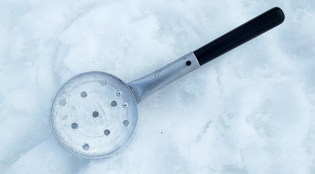 Черпак на рыбалке используют для вычерпывания ледяной крошки или шуги из лунки. Попутно его применяют многие рыболовы чтобы обивать лед, наросший на буре. Делать этого не рекомендуем, так как есть шансы повредить краску на буре. Для удаления наледи лучше взять с собой деревянный или резиновый молоток.