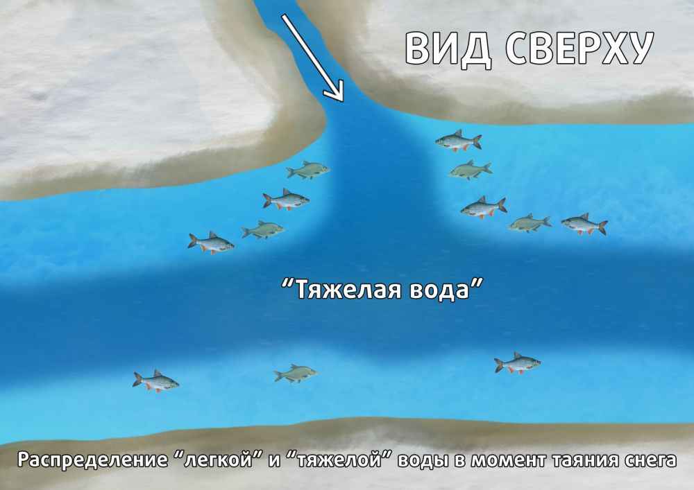 Талая вода холодная, её температура составляет около нуля. Лещ, густера и синец сторонятся такой воды – и предпочитают отстаиваться по границам холодных течений (рис. 2), либо продолжают оставаться «на зимних квартирах», совершая периодические прогулки вверх-вниз.