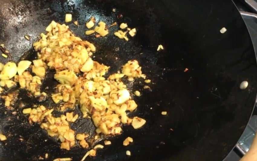 3. Вок поставьте разогреваться на средний огонь вместе с растительным маслом. В разогретое масло отправьте лук с чесноком. Обжаривайте до тех пор, пока лук не станет золотистым.