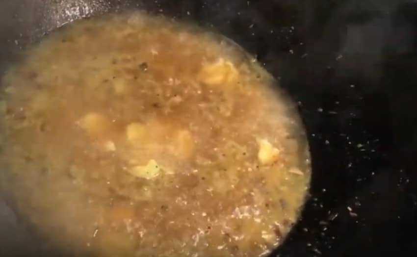 5. Влейте в вок вино и воду. Подержите на огне еще 4-5 минут. Если соус будет бурно кипеть, уменьшите мощность плиты. В середине варки посолите и добавьте душистый перец.