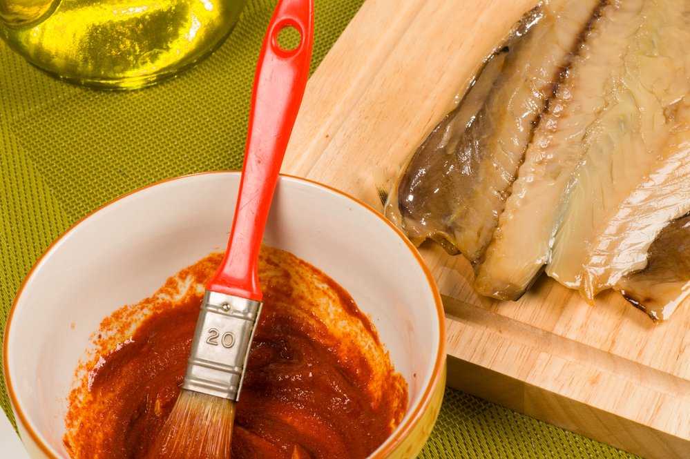 5.Смажьте обе рыбины маринадом со всех сторон, не забыв это сделать и внутри.