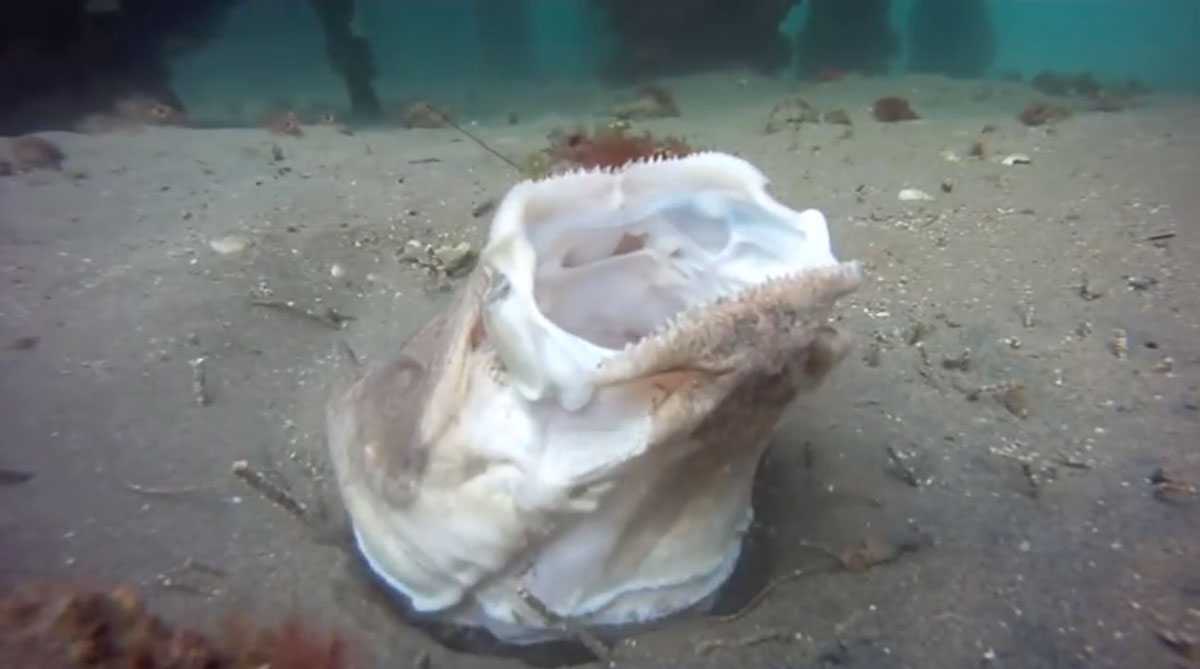 Эта уродливая рыба обитает на дне тёмных холодных океанов и может вырасти до внушительных двух метров в длину. Представьте себе, увидеть такое «чудо» в кромешной темноте и тишине, случайно осветив его на секунду мощным фонарём. У этих животных, как и у других морских хищников, характерно массивные челюсти с заострёнными назад зубами, позволяющими цепко держать и рвать плоть своей несчастной жертве. Но не пугайтесь так, потому что морской волк, на самом деле, не охотится на другую рыбу, предпочитая поедать крабов, морских звёзд, морских ежей и прочую добычу, которую трудно переварить.