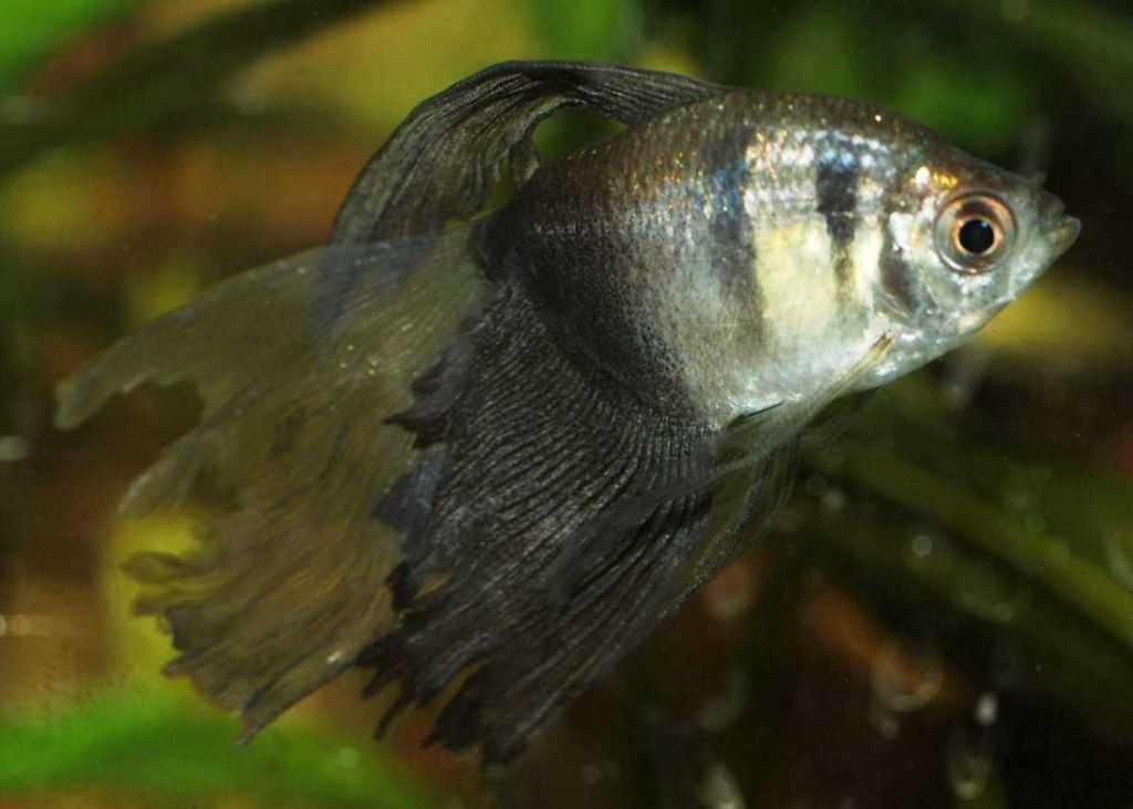 Вуалевая имеет большие плавники волнистой формы: спинной и брюшной окрашены тёмным почти чёрным цветом, а хвостовая часть прозрачная. Длина рыбки достигает в аквариумных условиях 5-6 см.