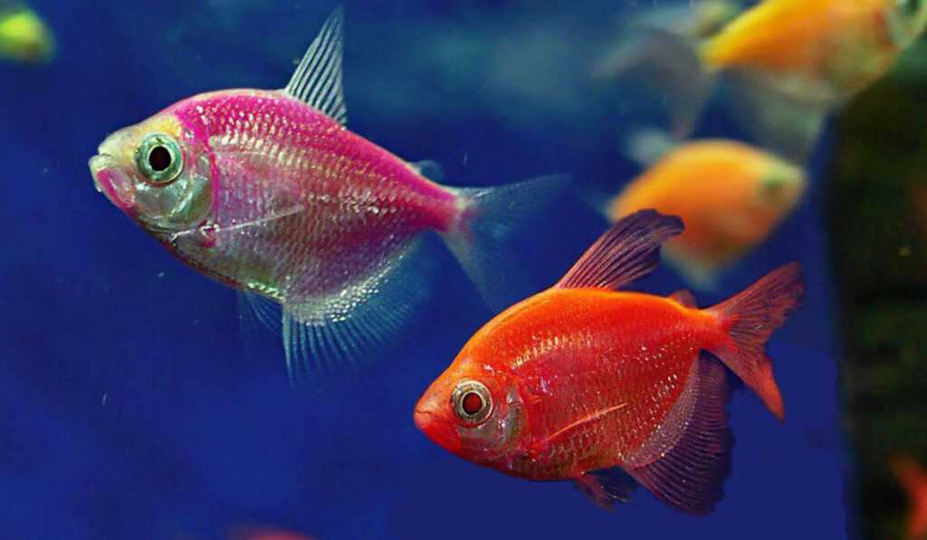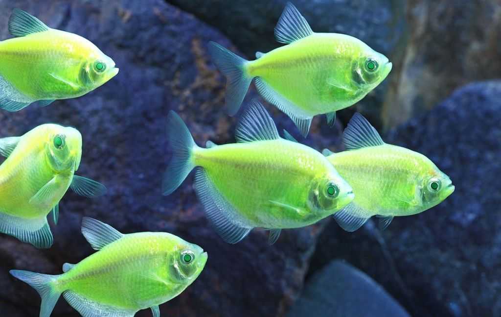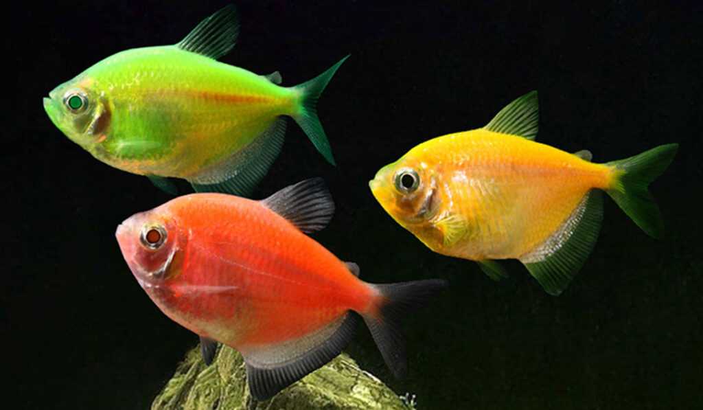 Зеленая флуоресцентная рыбка получена в результате внедрения ДНК медузы, что придаёт обычной тернеции красивого светящегося окраса.