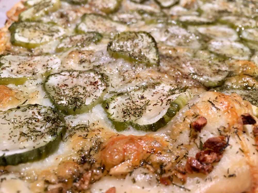 - Кетчуп распределить по всей поверхности основы, затем положить кусочки хека, лук, огурцы и тертый сыр.
