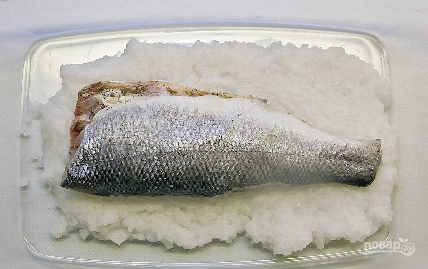 4.В форму для запекания рыбы выкладываю на дно половину подготовленного ранее солевого панциря. На солевую смесь выкладываю потрошенную и смазанную специями рыбку.