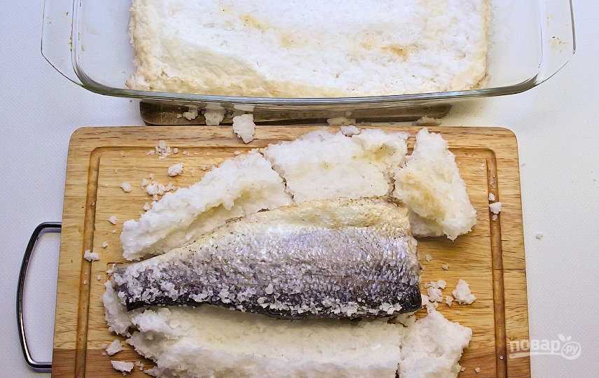 7.Достаю форму из духовки, ложкой стучу по соляному панцирю, чтобы он отошел от рыбы, после этого перекладываю рыбу на разделочную доску.