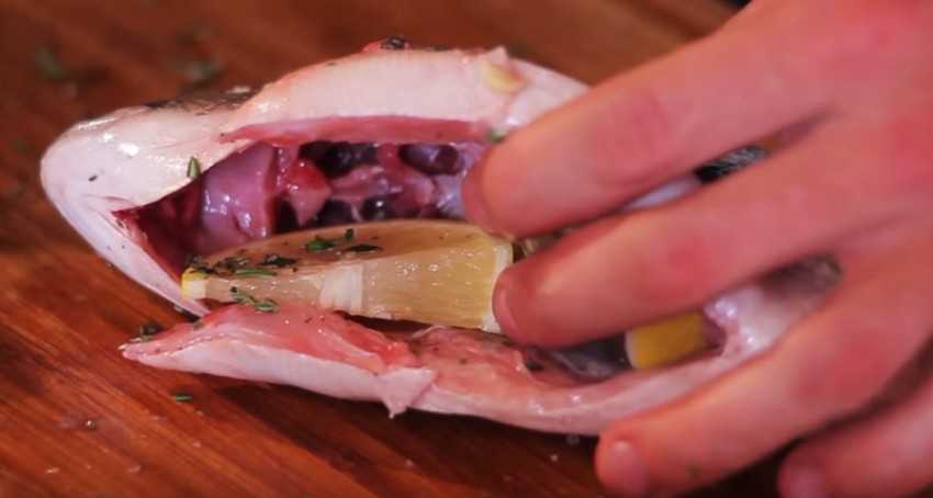 - Внутрь брюшка положите дольки лимона и колечки лука.