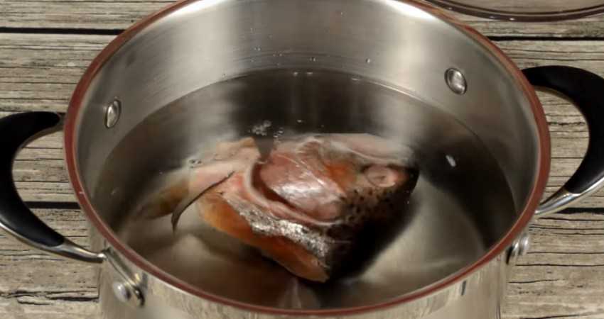 - В 3 – 4 литровую кастрюлю перелейте воду и положите в нее рыбу. Поставьте на конфорку и дайте закипеть, а после варите примерно 20 минут. Так бульон станет более густым.