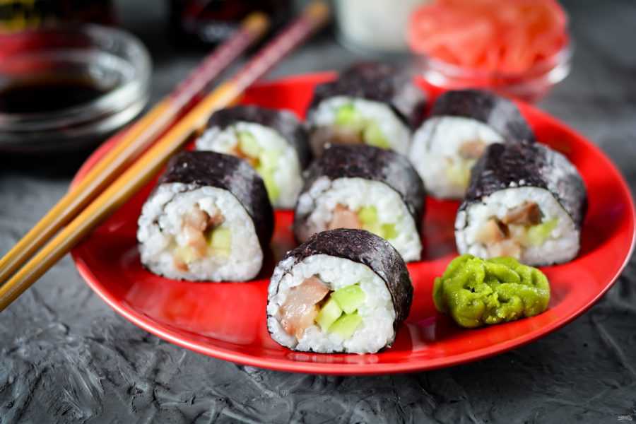 Закуска готова. Подавайте роллы с соевым соусом, маринованным имбирем и острой горчицей васаби. Приятного аппетита!