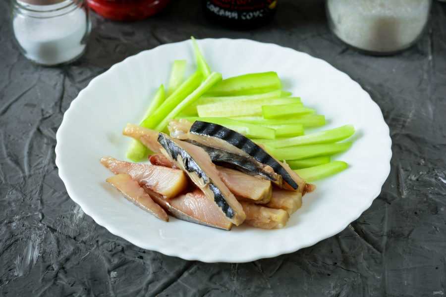 Также соломкой режем копченый угорь. Рыбу можно порезать достаточно крупными кусочками, ведь именно она формирует вкус нашего блюда.