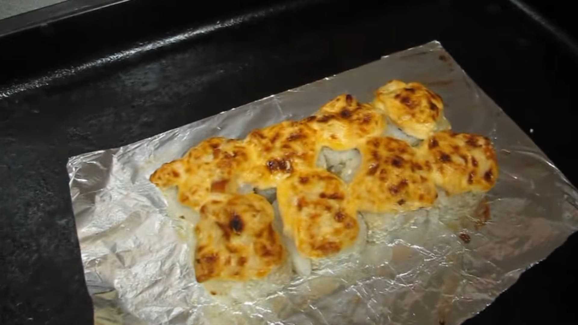 - На обжаренные роллы положите немного тертого сыра и запеките в духовке 7 минут.