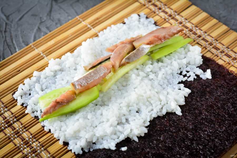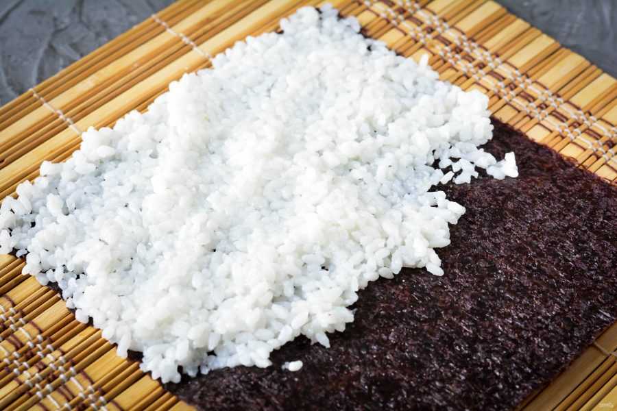 Когда рис остынет, возьмите бамбуковый коврик, положите на него лист нори блестящей стороной вниз, затем распределите равномерно тонким слоем рис по всему листу. Из стакана сухого риса должно получится 4 ролла.