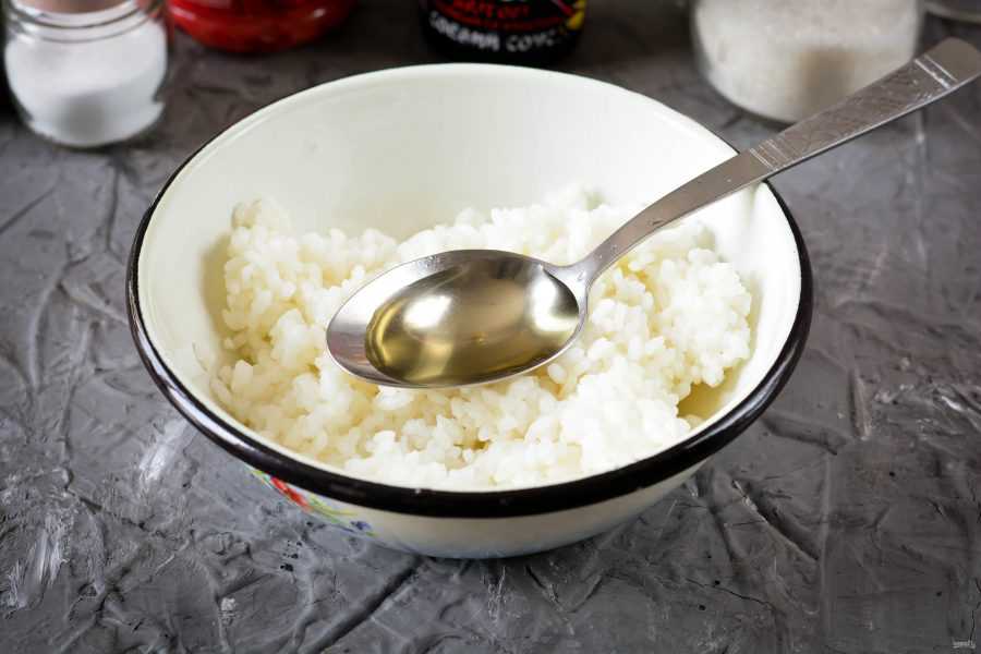 Когда рис сварится и немного остынет, заправьте его кунжутным маслом и тщательно перемешайте. И оставьте остывать до температуры 38-40 градусов.