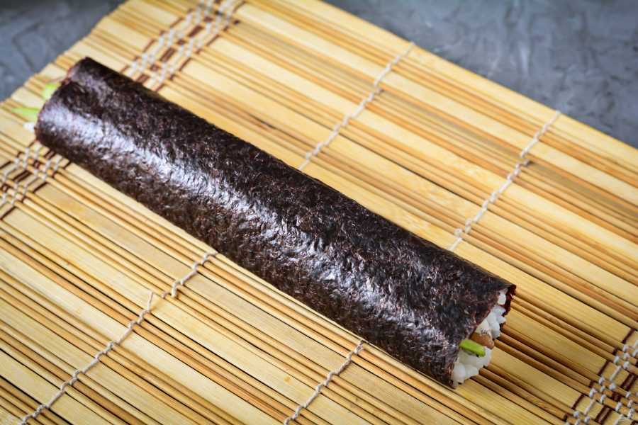 Далее при помощи циновки аккуратно сверните ролл, плотно утрамбовывая его содержимое, дабы рис с начинкой плотно держался, а во время разрезания ролл не распался.