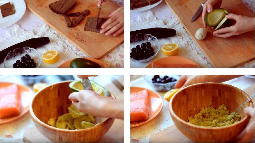 Далее, каждую хлебную заготовку хорошо смазываем пастой из авокадо. Сверху кладем по ломтику красной рыбки.