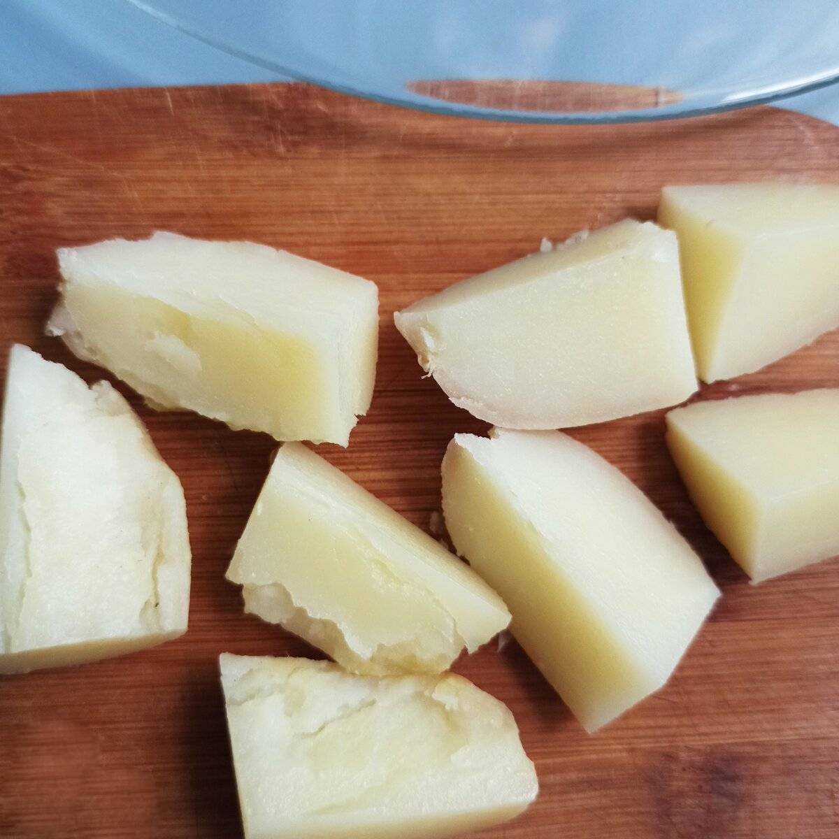Не забываем про картофель. Убедиться, что он готов, очень легко — просто проткните вилкой. Она входит легко, то плиту можно выключать. Картофель помещаем под струю холодной воды, чтобы его было легче очистить. Чистим от кожуры. Нарезаем довольно крупными кусками.