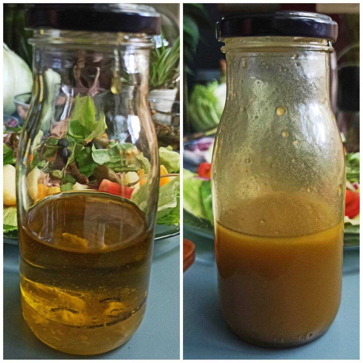 Теперь начинаем готовить салатную заправку. Делать ее будем в банке с крышкой. Рекомендую заправку приготовить в большем количестве, она хранится в холодильнике 2-3 дня, использовать можно для других салатов из свежих овощей.