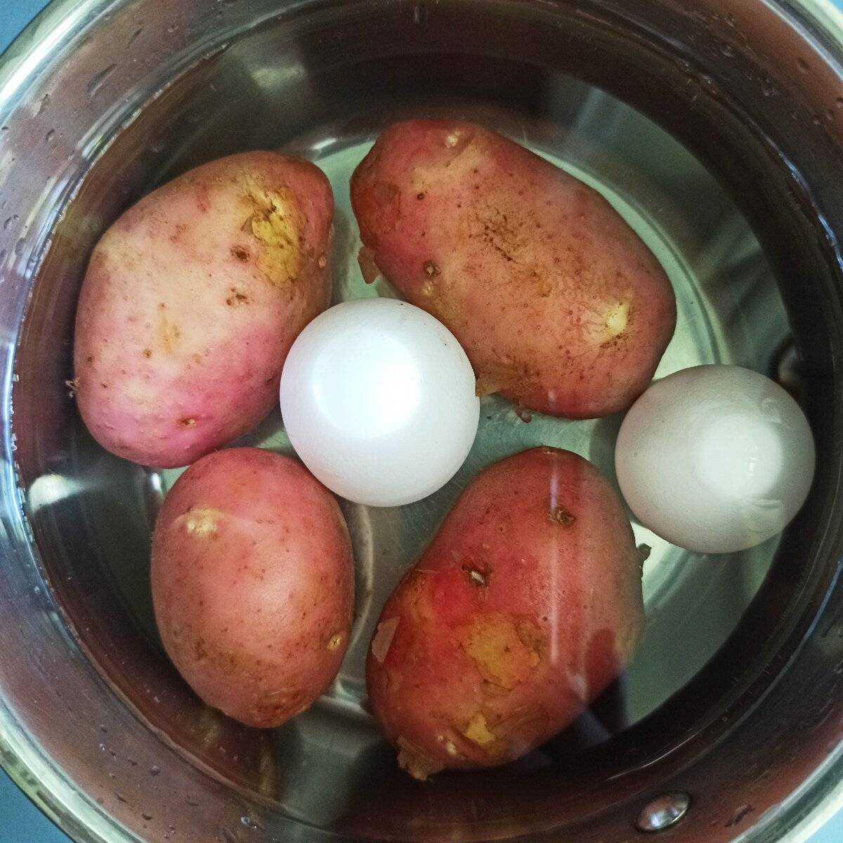Картофель как следует вымыть (удобнее это делать щеткой), сварить в мундире до готовности. В этой же кастрюле сварить яйца. Варить их минут 7-8 после закипания воды.
