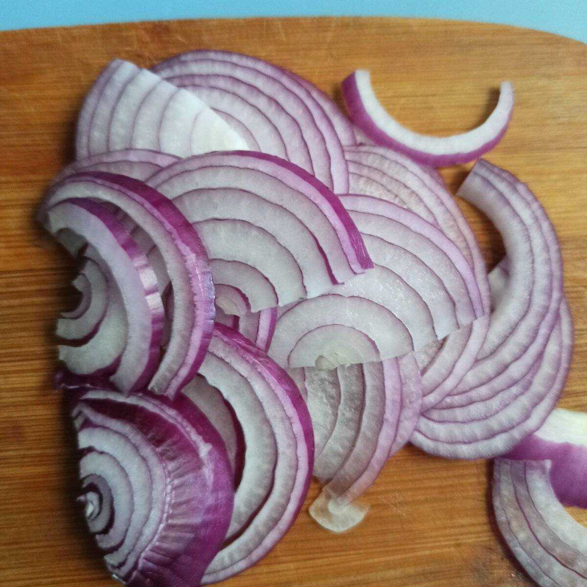 Ялтинский лук чистим от шелухи. Нарезаем тонкими полукольцами, чем тоньше — тем красивее будет смотреться в салате.