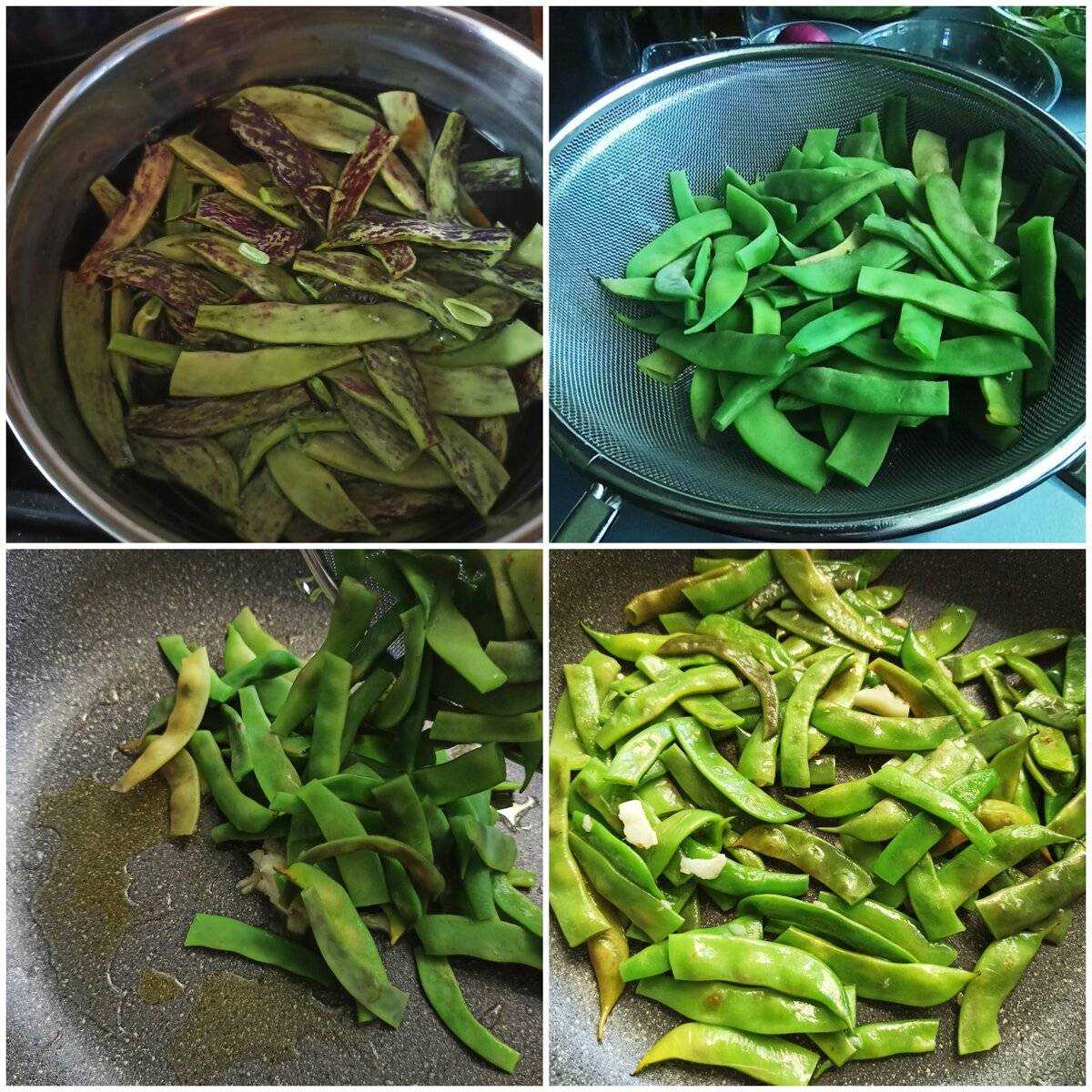 Свежую стручковую фасоль разрезаем на половинки. Опускаем ее в кипящую воду на три минуты. Откидываем на сито. Чистим зубчик чеснока, измельчаем его. Обжариваем на сковороде фасоль с чесноком в небольшом количестве оливкового масла буквально пару минут.