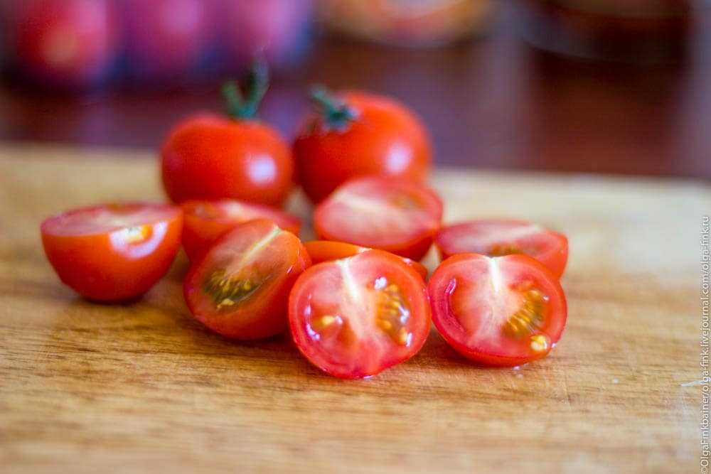 Черри разрезаем на половинки. Если используете помидоры другого сорта, то нарежьте их небольшими дольками.