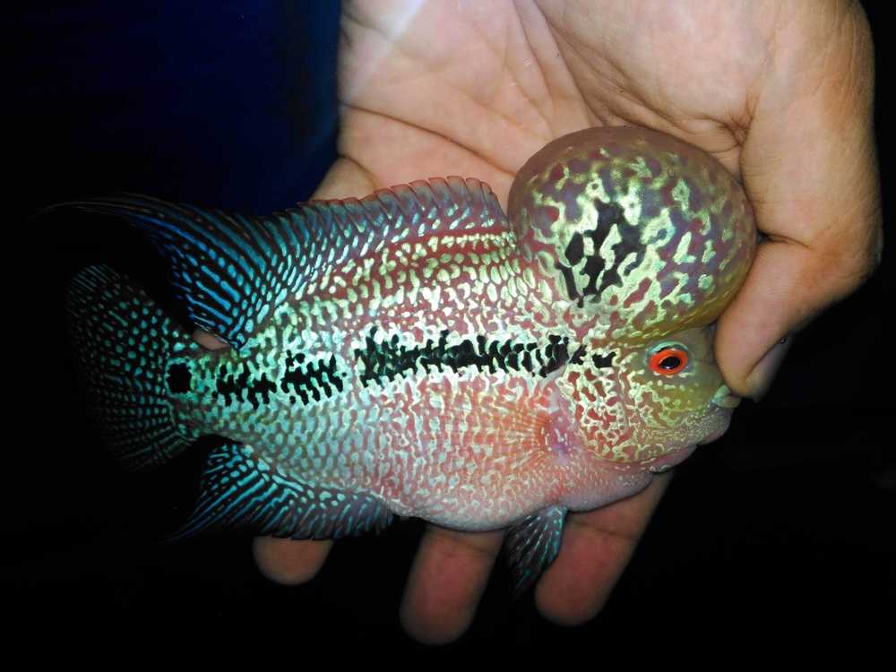 Фловер хорн — очень контактная цихлида, с удовольствием берущая корм с рук и любящая почесушки.
