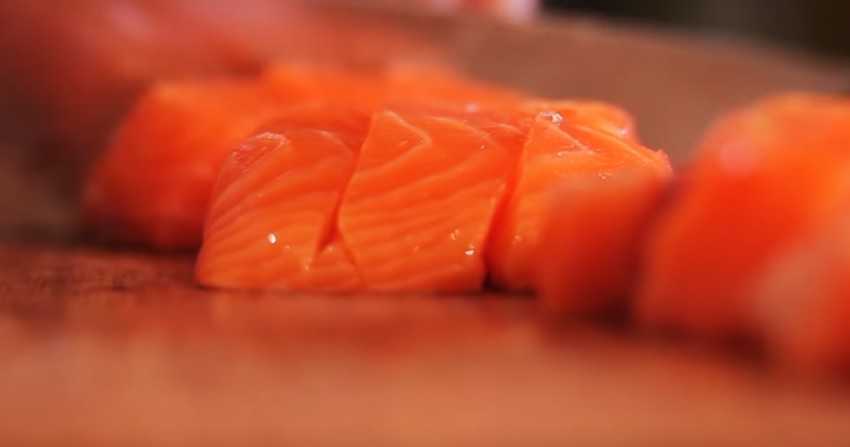 3. Филе сёмги нарежьте кубиками в 1 см и отправьте в бульон не более, чем на 5-6 минут.