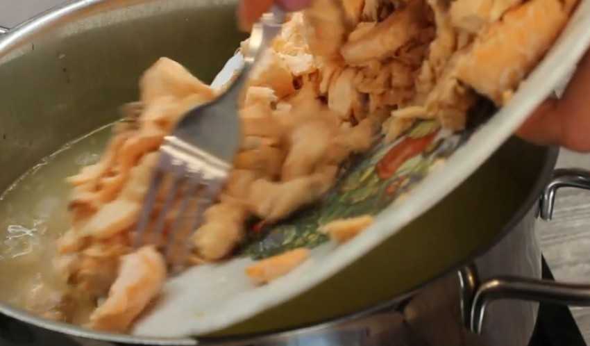 Когда картофель будет готов, отправляем в суп поджарку. Закладываем филе лосося — 300-400 грамм рыбы, зачищенной от косточек и нарезанной кубиком.