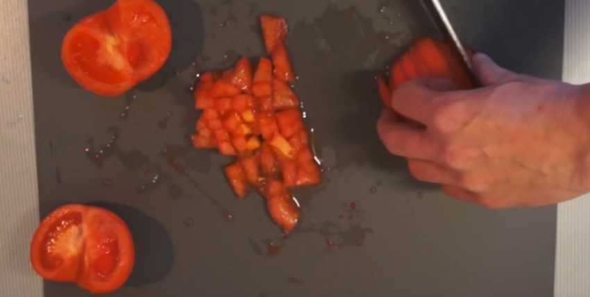 3. На томатах сделайте крестообразный надрез. Залейте их кипятком секунд на 30. Снимите кожицу, удалите плодоножку и тоже порежьте кубиком.