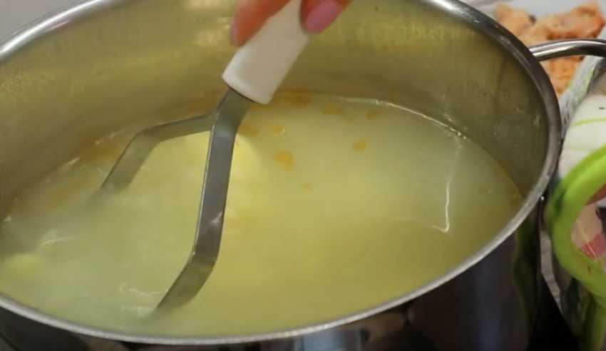 - В миску, где лежала рыба, добавить стакан молока и муку, перемешать, а потом вылить в суп.
