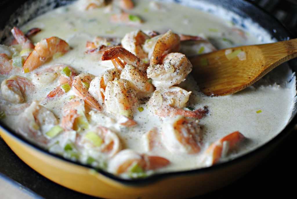 Состав компонентов: 45-55 г масла сливочного, 370 г креветок, смесь перцев, граненый стакан нежирных сливок, 3-5 чесночных долек, половина пучка петрушки, луковица, соль.