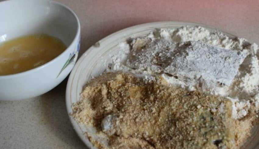 4. Запанируйте куски сначала в муке, потом обмакните в яйцо, в конце обваляйте в сухарях.