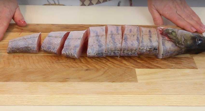 4. Если вы используете для приготовления целую тушку, то ее предварительно нужно почистить, удалить плавники, хвост, голову, внутренности и почистить изнутри. Затем промыть, нарезать на куски сначала вдоль, удаляя после этого хребетную кость.
