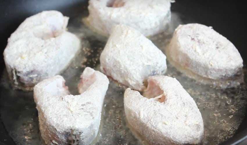 - Обжарьте рыбу в большом количестве масла с каждой стороны.