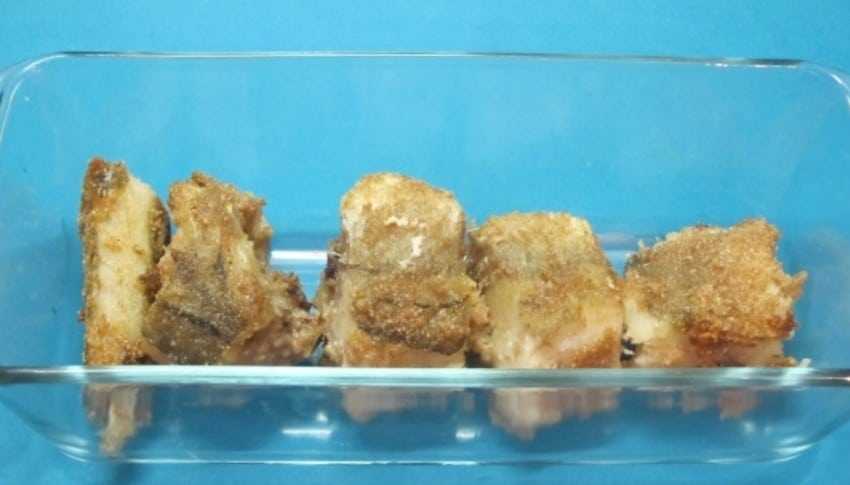 При приготовлении трески желательно использовать панировку, чтобы рыба не стала сухой после жарки. Перед тем, как отправить ее на сковороду, можно обваливать ее просто в пшеничной муке или добавлять туда толченые сухари, манку. Вкусная панировочная смесь получается из мелкой кукурузной муки или молотых крекеров. Запанированные рыбные кусочки при обжаривании покроются хрустящей корочкой, которая «запечатает» все соки внутри. Кстати, чтобы панировочный слой ложился более ровно, треску следует сначала окунуть во взболтанное яйцо.