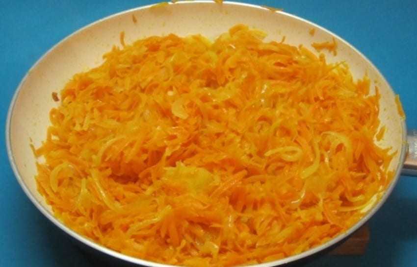 4. Отдельно обжарьте репчатый лук около 5 минут, после чего добавьте морковь и готовьте еще 5 минут.
