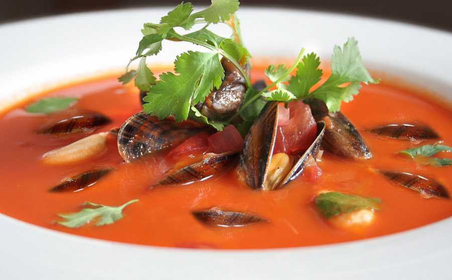 Томатный суп с креветками и мидиями