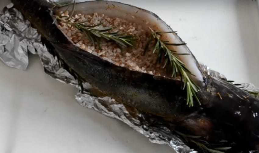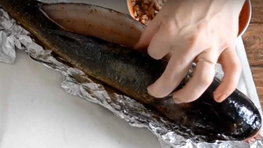 Если рыбка жарится без головы, то у неё удаляются глазки, заворачивается в промазанную маслом фольгированную бумагу и выпекается рядом с тушкой.