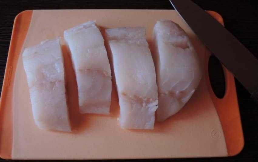 Филе нарезаем на порционные кусочки. Лучше всего взять филе трески, тогда не придется очищать рыбу от косточек после варки. Для приготовления этого блюда подойдет также простой минтай. В советское время готовили именно минтай и получалось не менее вкусно.