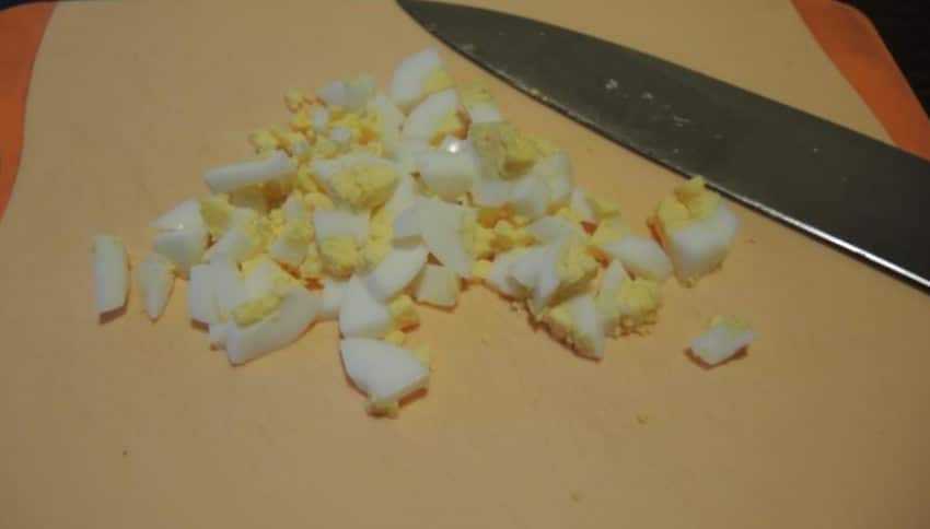- Пока рыбка готовится, очистить яйца, нарезать их мелко (можно потереть).