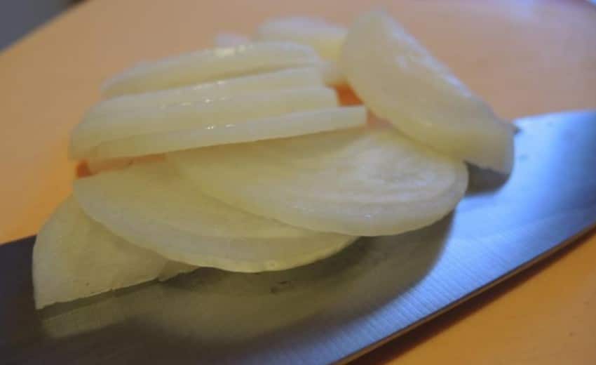 6.Для заправки нарежьте лук полукольцами, а морковь просто натрите на крупной терке.