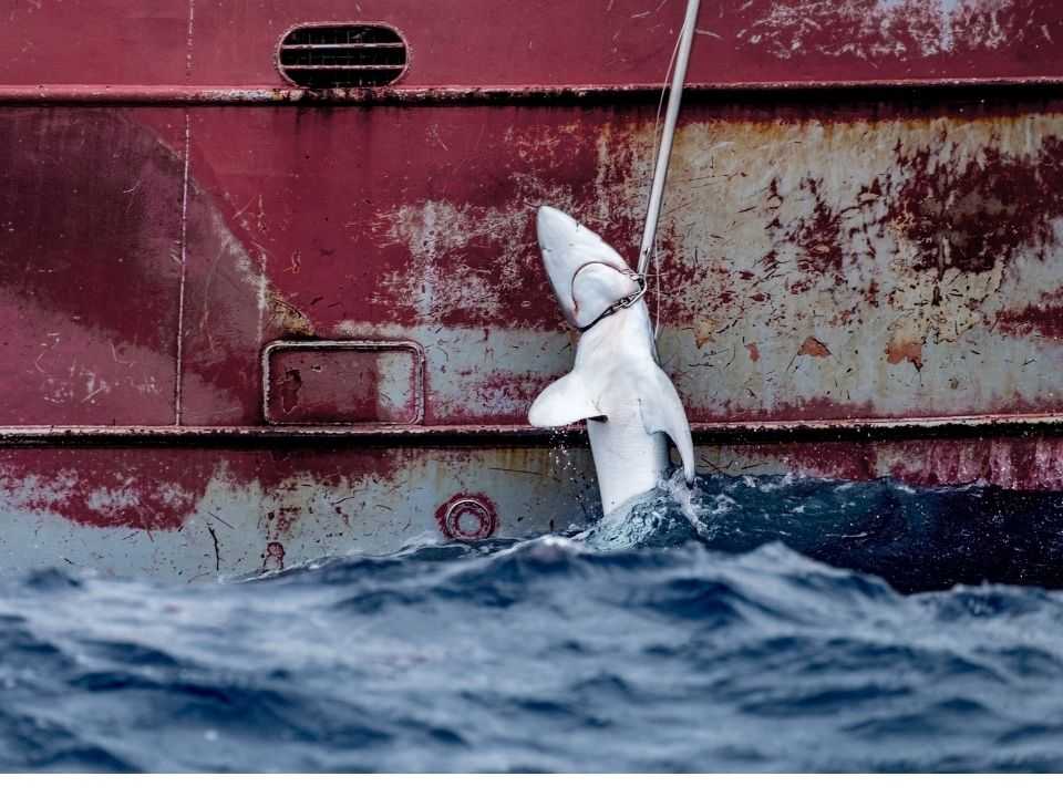 Акулу затаскивают на испанское судно ярусного лова Nuevo Zumaya. Фото: Tommy Trenchard / Greenpeace
