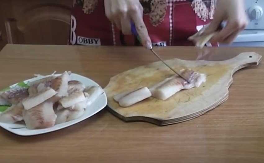 Для приготовления нашего блюда рыбу или рыбное филе мы нарежем на небольшие кусочки. Делать это лучше, когда морепродукт еще чуть подмороженный.
