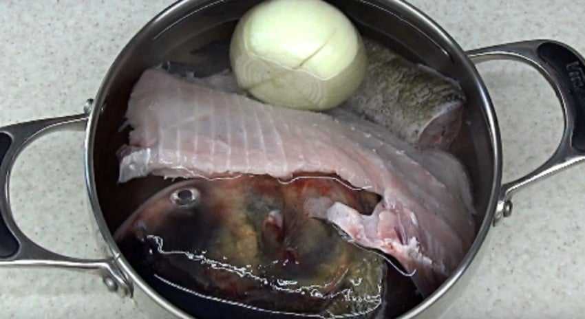 - Удалить жабры из голов толстолобика, сложить их в кастрюлю. Добавить чистой воды и сварить бульон. В него сразу положить луковицу в шелухе, горошинки перца, лавровый лист. Готовить 40 мин.;